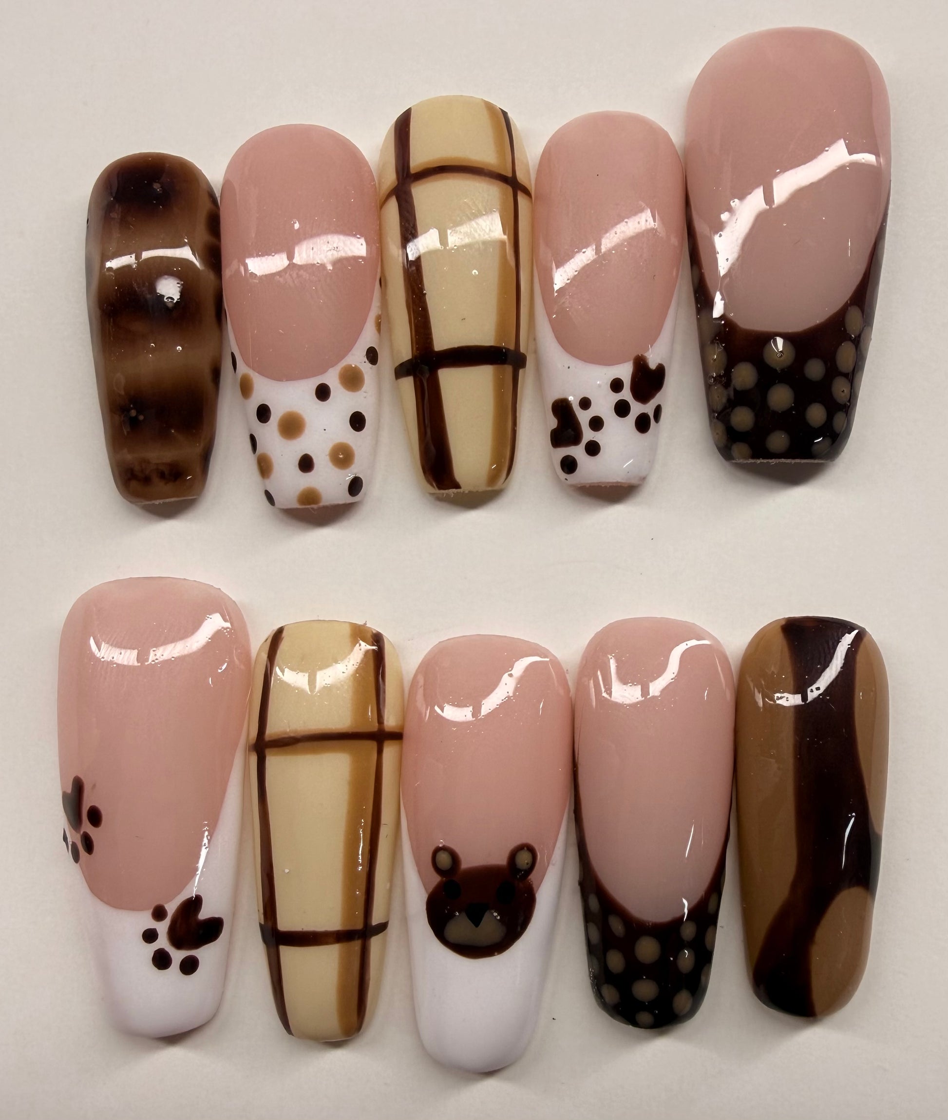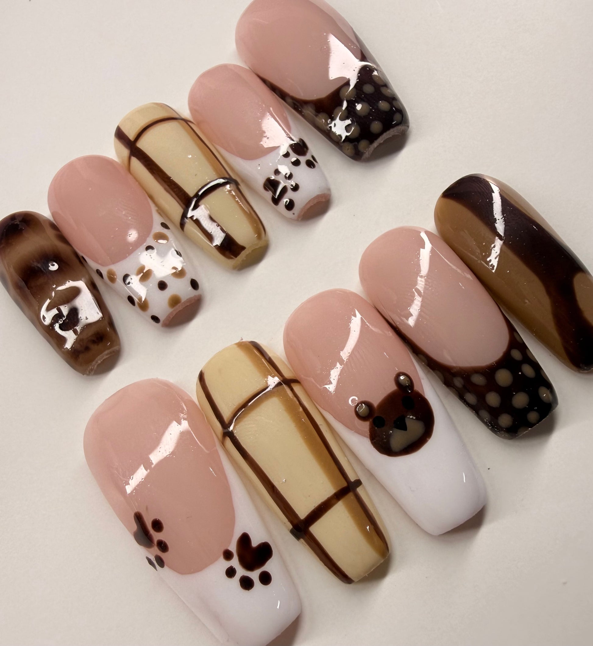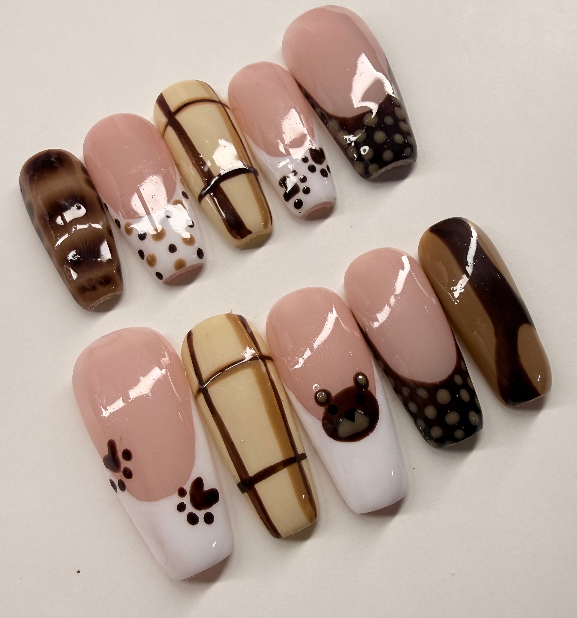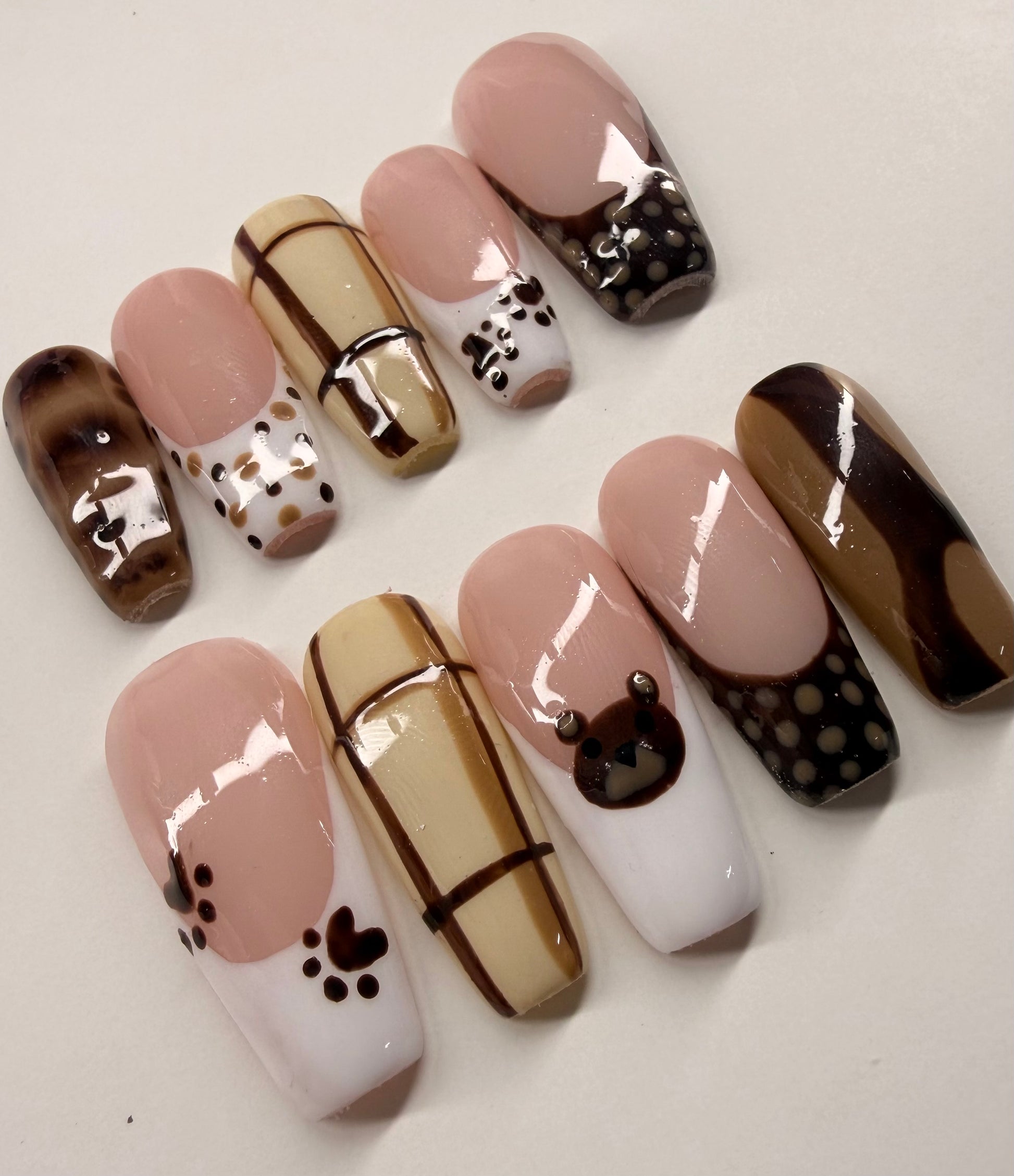 Meet Bear Latte, the perfect neutral set for anyone who loves a soft, warm, and classy vibe. Shown in a long coffin shape, this set blends cozy brown tones with a smooth, latte-inspired finish that’s perfect for everyday wear or a subtle glam look.