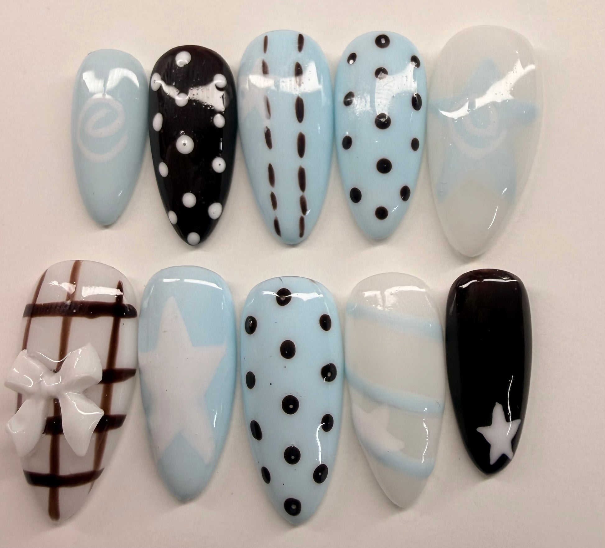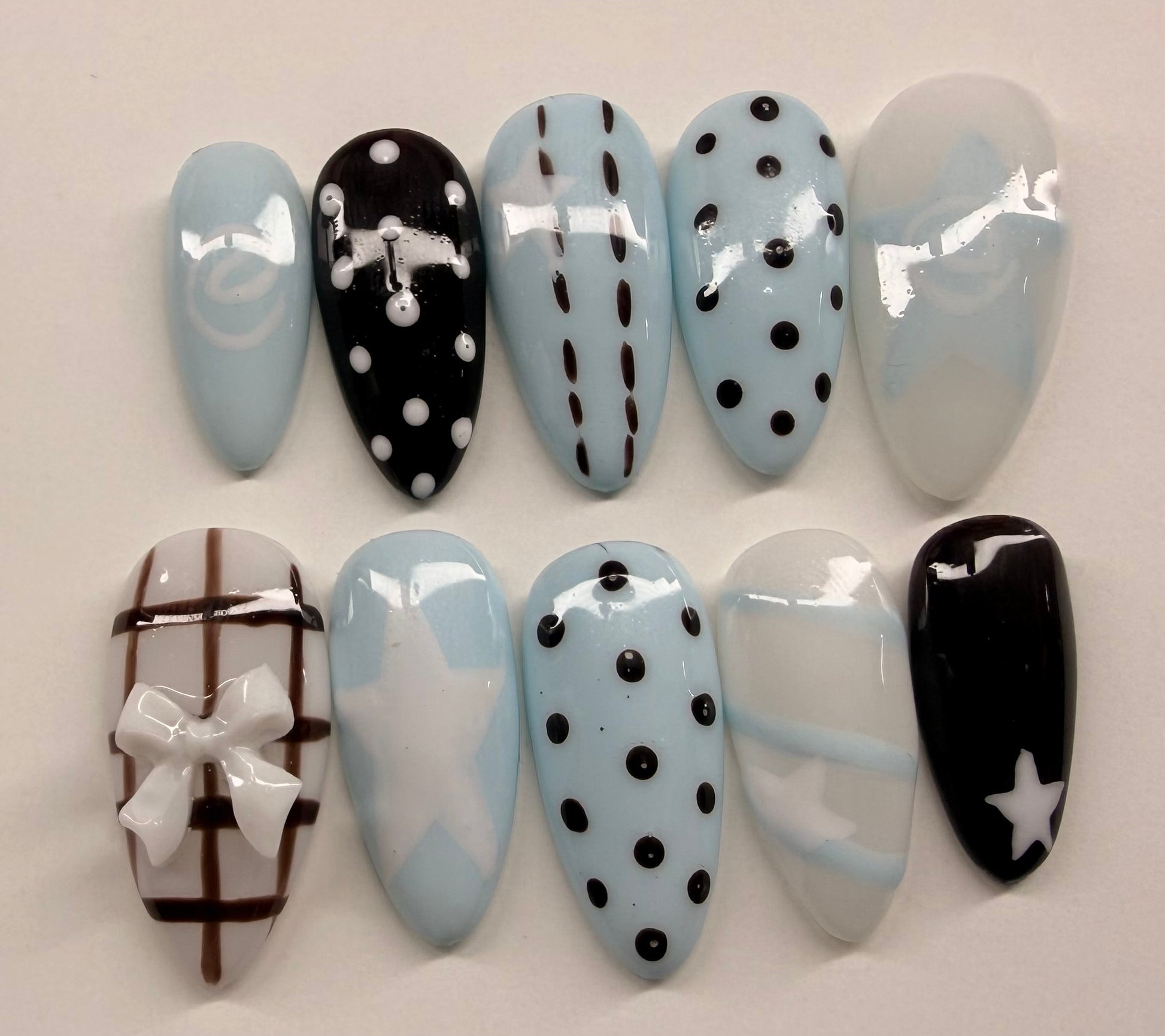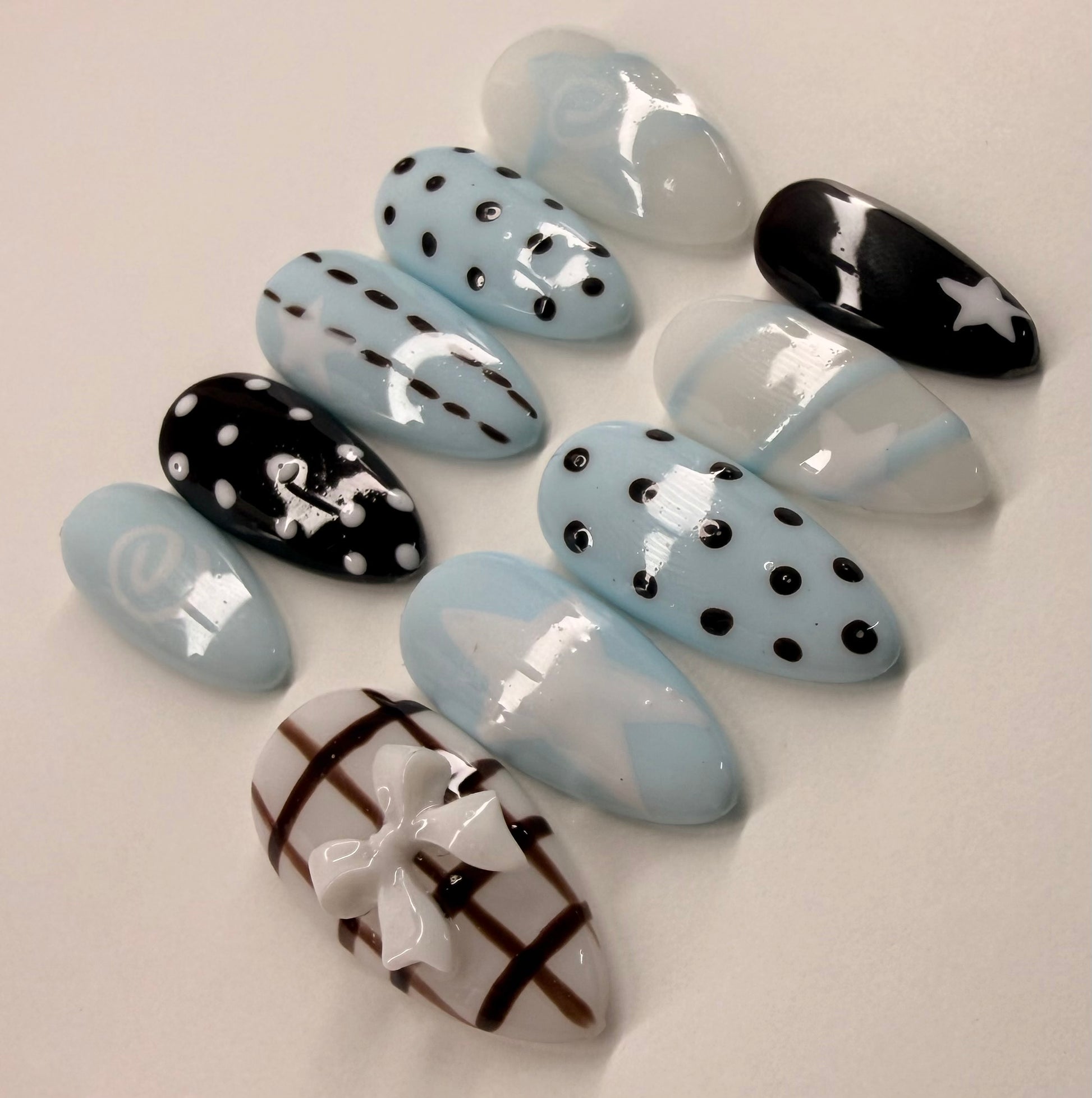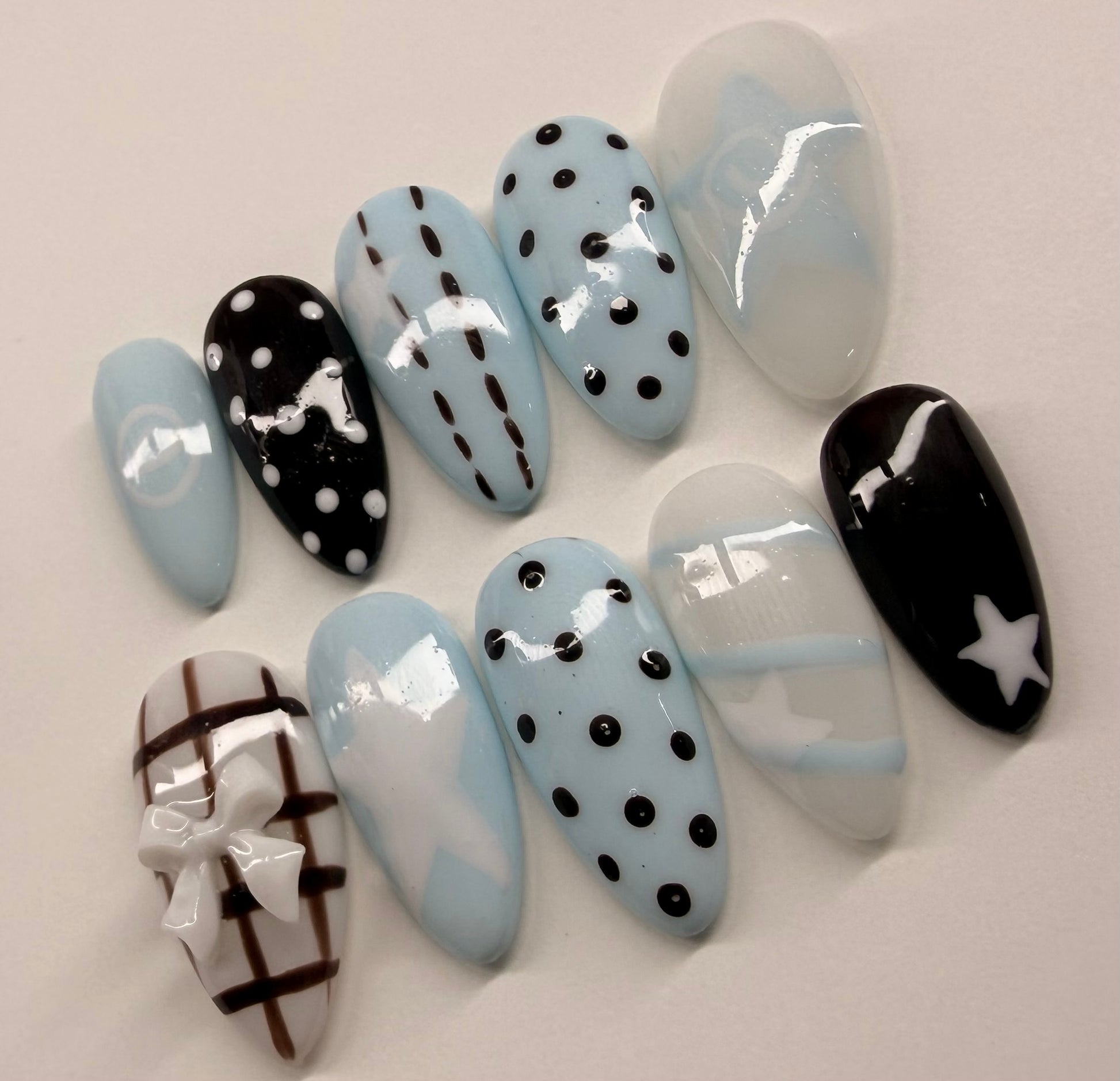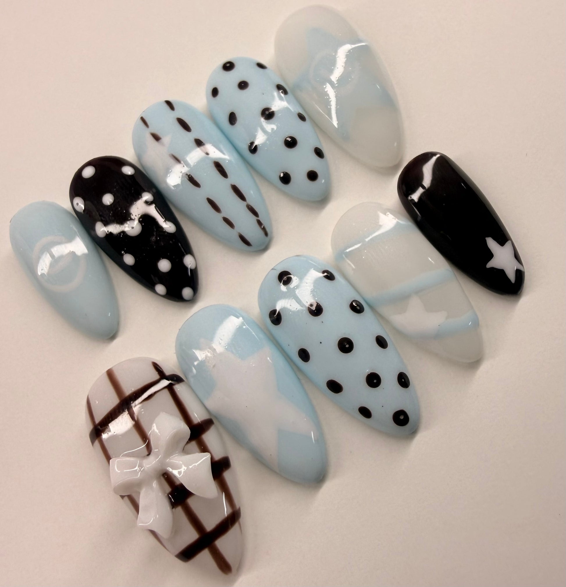 Meet Mint Chip, a handmade mixed-pattern nail set featuring soft minty blues, bold browns, and crisp whites with playful designs like stars, polka dots, crosses, stripes, and a 3D bow accent. Shown in a medium almond shape, this set blends cute and trendy elements for a fresh, eye-catching look.